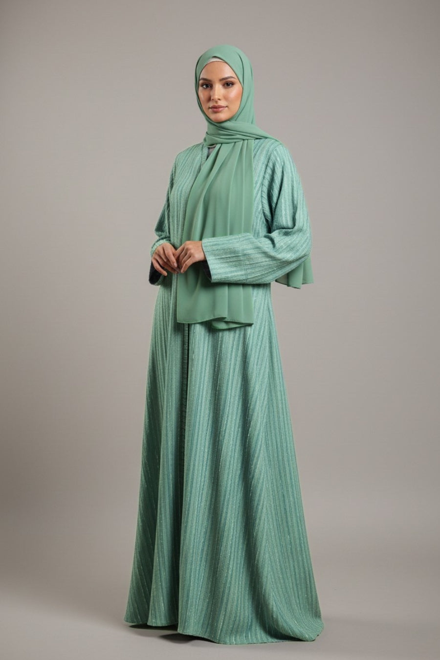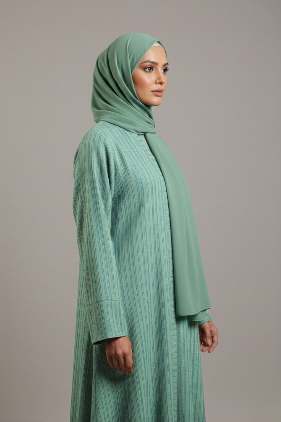 Includes: Matching Pistachio Georgette Hijab — the finest color match will be sent with the abaya for a complete coordinated look.